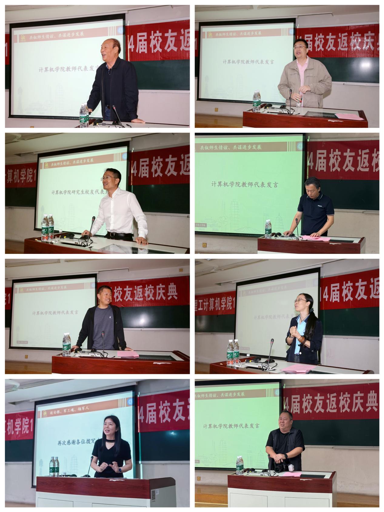薛静锋以《打造高端队伍,深化内涵建设,构筑学院一体两翼融合发展新格局》为主题详细介绍了计算机学院在学科建设、师资队伍强化、科研平台优化,以及拔尖人才培养等方面的最新进展。教师代表王树武、陈朔鹰、余海滨、林永钢、史树敏、王全玉、段炼依次发言,分享了与校友共度的宝贵记忆,并表达了对校友们未来事业的美好祝愿,鼓励校友们经常回访母校,与学院保持紧密的联系,共同参与到学院的各类活动中来,强化校友网络,为彼此的发展提供助力。