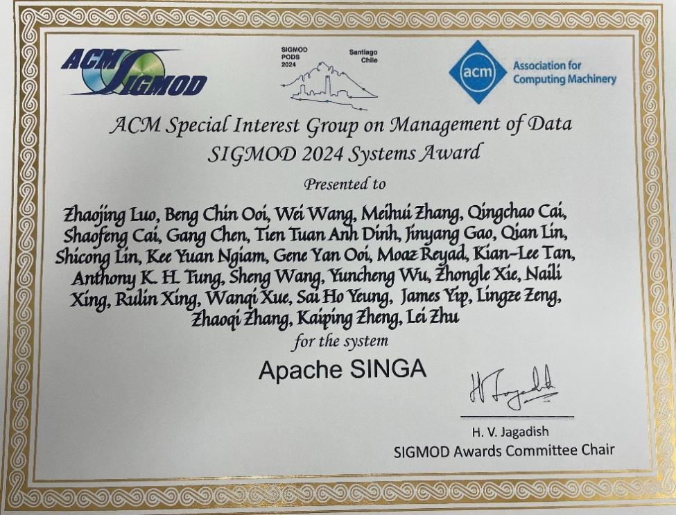 6月9日到6月15日于智利圣地亚哥召开的ACM SIGMOD 2024会议上,国际计算机学会(ACM)宣布将2024年ACM SIGMOD Systems Award授予Apache SINGA项目研发团队,以表彰其在研发分布式、高效、可扩展且易于使用的深度学习平台以用于大规模数据分析方面的贡献。主要获奖人员包括我校计算机学院教授张美慧、罗兆经。