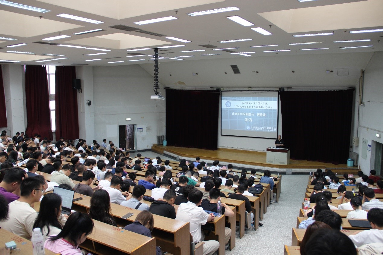 会上,周连景首先代表全院师生对2024级研究生新生的到来表示热烈欢迎,并祝贺大家迎来全新的学习阶段。他从计算机学院的历史沿革谈起,向同学们介绍了学院三步走发展战略,并结合学院学科水平、组织架构、师资队伍、人才培养、科学研究、党建思政等方面介绍了学院的整体情况,并向同学们介绍了学院以面向国家重大需求,全力推进卓越研究生教育,培养一流拔尖创新人才为核心的研究生培养思路。他鼓励同学们立大志,做大事,以实际行动践行“请党放心、强国有我”的青春誓言;修大德,怀大爱,锤炼品德修为,塑造高尚人格;入大局,担大任,更快地成长成为推动科技进步和社会发展的中坚力量。